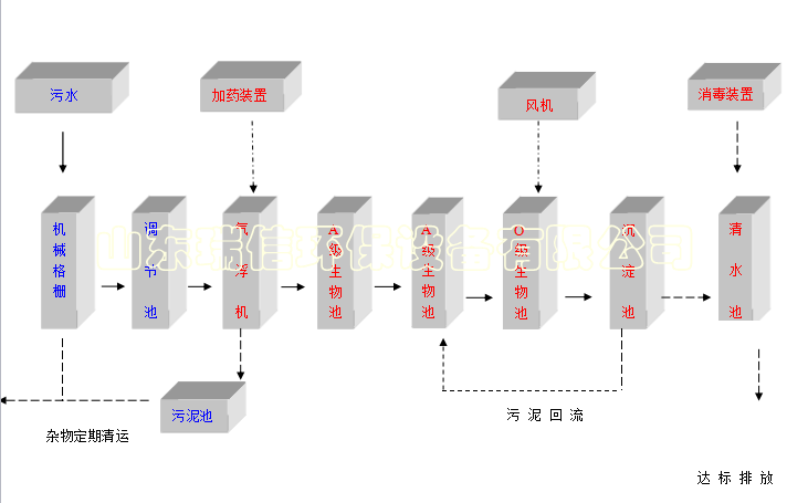 針對該項目具體污水水質的特點,本方案擬采用常規的“氣浮機(加藥)+A/O/O生物接觸氧化+消毒設備”工藝,該處理工藝較為成熟,操作運行方便,日常費用低廉,出水穩定,主要設備為鋼結構,考慮到周邊環境和衛生問題,故該污水處理工程決定采用全埋地式結構,上部覆土,種植花木、草坪,進一步美化環境。