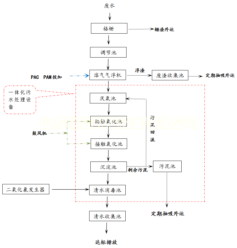 廢水首先經(jīng)過機(jī)械格柵進(jìn)入處置系統(tǒng),格柵可以去除廢水中較大粒徑的懸浮物、漂浮物、皮毛、肉屑、骨屑、血污等雜質(zhì),出水進(jìn)入隔油調(diào)理池,此池前部為隔油池,去除廢水中部分油脂,后部為調(diào)理池,對水量及水質(zhì)中止調(diào)理。調(diào)理池出水由提升泵提升至氣浮池,氣浮采用一元化氣浮裝置,它由池體,溶氣罐、空壓機(jī)及回流水泵組成,由一個電控箱中止控制操作。廢水中有大批的粗大懸浮物及油脂,經(jīng)過氣浮裝置的處置可大大降低上述污染物濃度,在氣浮設(shè)備義務(wù)時參與高分子絮凝劑,廢水經(jīng)加藥反響后進(jìn)入氣浮池內(nèi),與經(jīng)過TJ型釋放器釋放的氣泡充分混合接觸,使水中的絮凝體粘附在宏大氣泡上,釋放的氣泡平均直徑Φ30um左右,絮體浮向水面構(gòu)成浮渣,浮渣聚集到一定厚度后,由刮渣機(jī)刮入氣浮泥槽道送到污泥濃縮池,氣浮池下層的清水一部分經(jīng)溶氣泵抽送供溶氣水運(yùn)用,剩余的清水經(jīng)過溢流管進(jìn)入后續(xù)處置單元。氣浮可以去除80—90%的懸浮物和40—50%的CODcr。同時,由于在氣浮池內(nèi)參與了混凝劑,與廢水中的磷酸鹽反響,生成更難溶于水的鹽類,從而將廢水中的磷較好的去除,添加了后續(xù)除磷處置單元的負(fù)荷。